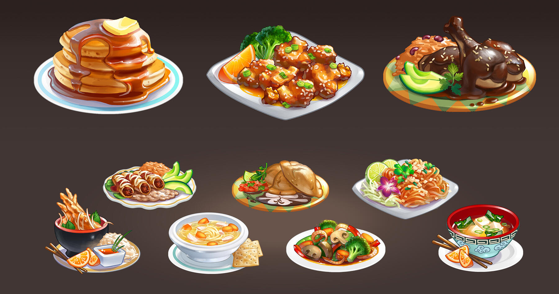 A social cooking game made by Zynga. I designed and painted all these assets from start to finish. Although, an occasional plate, carrot, or garnish may have been pulled from our "food library" created by the whole art team.